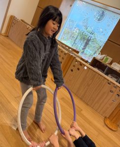 フラフープでの引っ張りでは一人だと簡単なので二人三人と増やしました。