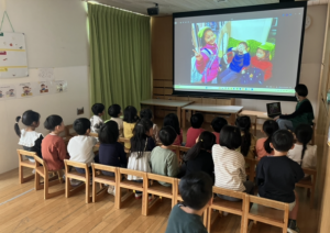ひまわり組さんの卒園遠足の様子を写真とともにばら組さんへ伝える時を持ちました。