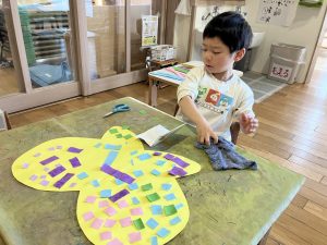 今日は春のちょうちょう製作を行いました。今年1年練習をしてきたはさみとのりつけで色の飾りつけをしました。そのあとはグラウンドへ行きました。その様子は下に掲載しています。
