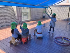 その後ちゅーりっぷ組はデッキで過ごしたのですが、「横断歩道やりたい!」と声が上がり、コンビカーに乗りながら、歩きながらフラフープ信号を見て進む遊びをしていました。フープの信号は子どもアイデアでしたが、交通安全教室さながら赤のフープが上がるときには信号を見ながら止まっていました。黄色フープのときは「チカチカ」と本物のように点滅音を出していました。遊びの中にも活かす力に驚きです!(東 石元 谷口 中山)