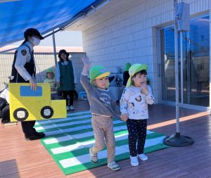 また、車から手が見えるように低くではなく、ぴしっと高く上げることも大事だとお話ししてもらい、信号や標識を見ながらいざ、実践タイムです!信号が青になるとすぐに歩き出す子が多くいましたが、「まずは何をするんだっけ?」と声をかけてもらい「右、左、右!」と確認をして渡っていました。さすがひまわりさんは1人で実践でしたが左右確認、止まれの標識でも足を止めるなど、園外活動での先頭練習の成果が出ていますね。ちゅーりっぷ、ばらは2人組になり実践しました。今日教えていただいたことを忘れずに、園外活動の際にも子どもたちと周りを見て、確認をしながら歩くことを進めていきたいと思います。ぜひ、ご家庭で歩く際にも子どもたちと確認をしながら、白線の内側を歩く、道路は歩いて渡るなど伝えていただけたらと思います。