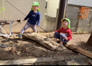 そのあとはグラウンドへ行きました。朝の雨模様とは一変、暑いくらいの日差しの中で過ごしました。大きな切り株を木の枝で削り、今生えている木に入れ替えるとのことです(笑)大きな木に入れ替えるには「固いな~」と言っていましたが実現できるかな?子どもたちの創造力は面白いですね。この大工作業は1時間ほど続けられていました。