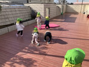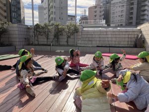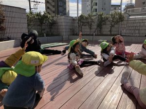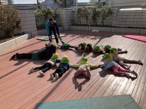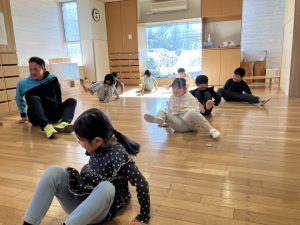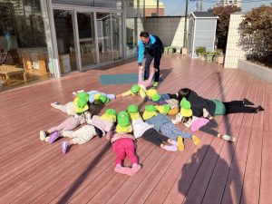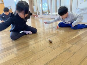 今年初めての運動あそびでは「コマ回し」をしました。道具を使ってコマ回しをする前に、自分自身がコマになって体を動かしました。「お腹」「片足」「お尻」「ひざ」でクルクル回りました。