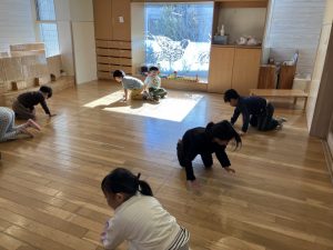 ↑クマ歩きはハイハイとは違い、おしりを上げ高這いで進みます。普段はなかなかない動きですね。日々の保育中の動きにも取り入れたいなと思いました!