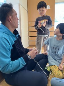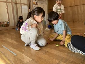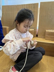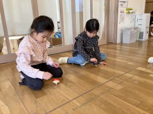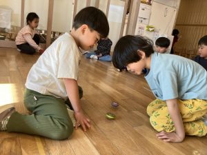 そのあとはひもを使ったコマ回し。日常生活で巻く動き、コマに触れることも少ないので、紐がゆるゆるになってしまう子どもたち(難しかったら先生たちに手伝いを求めてもOK)。巻くのがほどけてしまっても根気強く続け巻くことができた子もいました。できたことをすごく喜ぶ姿がありました。