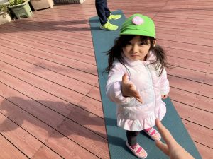 前回もよく楽しんだジャンケンサーキット。3つのマット島の上でお友だちとジャンケンをし、勝ったら次の島に移動します。移動方法はスキップやクマ歩きとその時々で変わりました。ジャンケンにも段々と慣れてきた様子が見られますね。