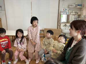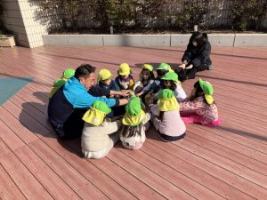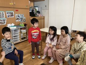 帰ってからは、ばら組タイムと称したお話タイムを設けました。テーマは「今年頑張りたいこと」です。1月から3月までの見通し(お店やさんごっこや移行があること)を伝え、4月にはひまわり組さんになること伝えたうえでみんなに話してもらったので、「お店やさんごっこを頑張りたい」「赤ちゃん(移行で上がってくるたんぽぽさん)のお世話をしたい」など進級を見据えたそれぞれの頑張りたいことを教えてくれました。「ひまわりさんみたいにラキューが上手になりたい」という話もありました。残り数か月となりましたが、ひまわりさんや年下のお友だちと過ごす時を持つ中で、憧れの気持ちや心地よい関わりを重ねてほしいと思います!また、自分の思いを言葉にして伝える機会もくり返し持っていきたいです!