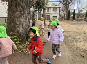 今日から新しい年が始まりましたね。登園してから「あけましておめでとうございます!」と子どもたちからもたくさん挨拶をしてくれました。グラウンドに行くときに会った育成園のお兄さんやお姉さんにもご挨拶をしていましたよ。