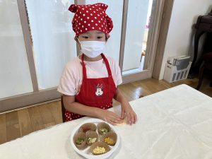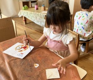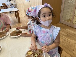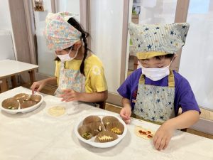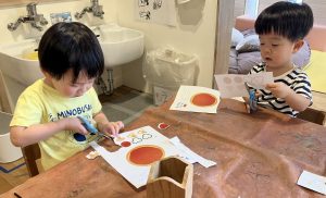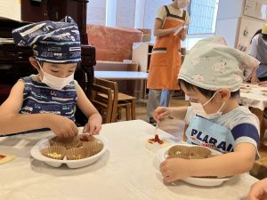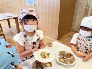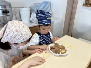 初めてエプロン・三角巾をつけたちゅーりっぷさんも、お兄さんお姉さんの優しいお手伝いを受けて準備をし、”こうやってやったらいいんだ!”と安心できるリードがある中活動を進めることができました。作っている時からトマトソースのいい匂いが漂っており、「もうたべたくなっちゃった♪」という声も聞こえていましたよ(笑)みんなで育てた夏の恵み、おやつに食べることが楽しみです。(岩口、三宅、本多)
