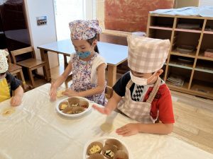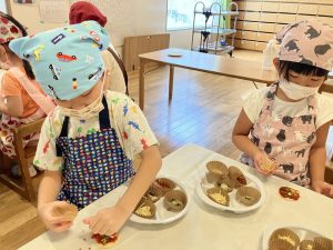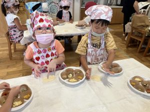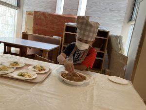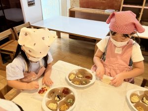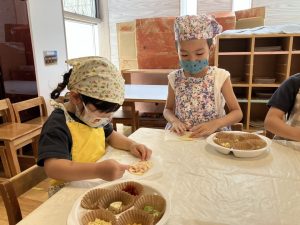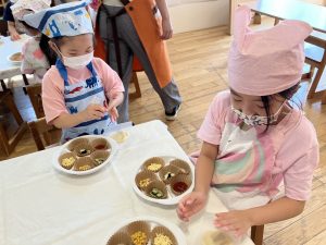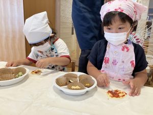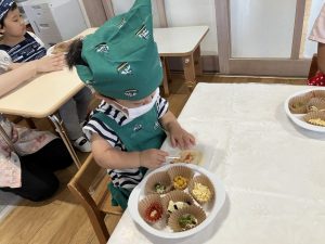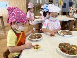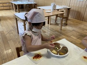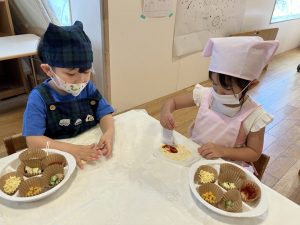 材料が配られると「せんせー!やっていいー!?」と待ちきれない様子です☺それぞれすぐに作業に入っていました。ばら・ひまわりさんは自分で生地を伸ばします。楕円の形になったり、ハートの形にしたりしてこだわりを持つ子もいました。トッピングのピーマンで顔を作る子もいましたよ。