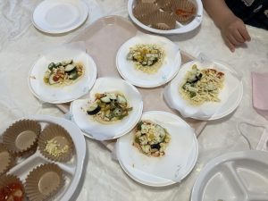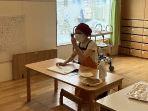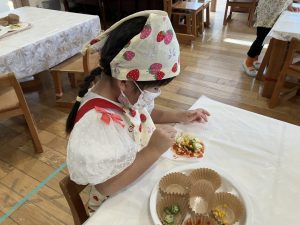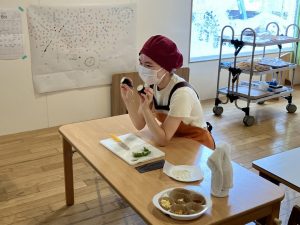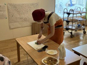 かな先生に来てもらい、目の前で野菜を切ってもらったりピザの作り方を教えてもらいました。作り方は①生地を伸ばす(ちゅーりっぷさんは丸く伸ばしたものを提供しました)②トマトソースを塗る③トッピングをのせる です。