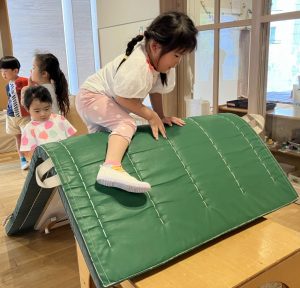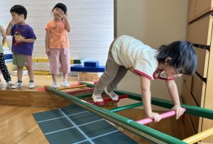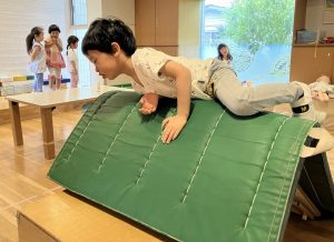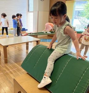 ピザ作りを待っている間や終わった後は別のお部屋で体を動かしたり、切って貼って作るピザやレゴブロックなどと好きな遊びを選んで過ごしました。(東、中山)