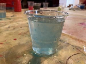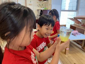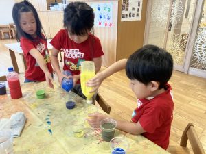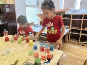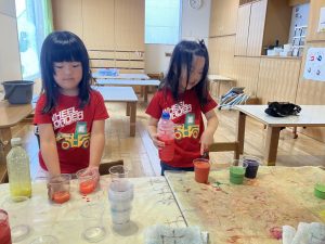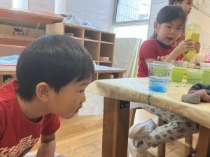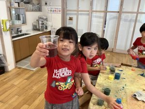 今日は礼拝後色水遊び第2弾を行いました。前回お休みのお友だちもおり、今日が初めて!やりたかった!と声が挙がっていました。前回子どもたちの手で絵の具の混色を確認したことを改めて振り返り、「今日は○○色作ろうかな~」と考えているようでした。