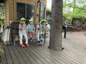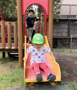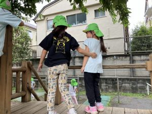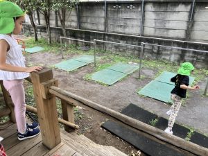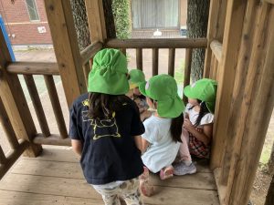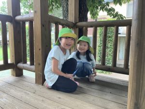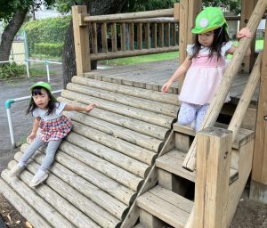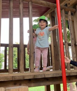 自由遊びでは久しぶりのツリーハウスで登り棒やすべり台を楽しんだり、子どもたちなりにお友だちと声をかけあってかくれんぼや追いかけっこをしてみたりと、のびのびと体を動かすことができました。
