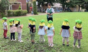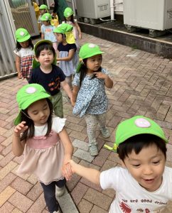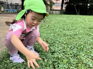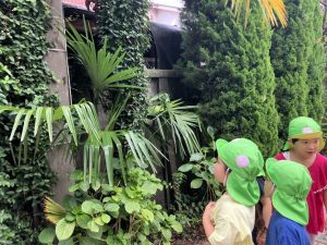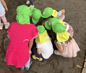 グラウンドへ向かう中門付近の電柱でセミを発見!少し高い位置にいたので捕まえることはできませんでしたが、この出会いから、「じゃあグラウンドにいるか探しに行こう!」とみんなのグラウンドに行く共通の目的が生まれていました。セミがどこにいるか知るために、セミの声を聞いて行こうという話にもなり「しーっ」とよく耳を澄ませてグラウンドに行きました。静かにしようとすると、歩き方も抜き足差し足でゆっくりになるばら組さんでした(笑)