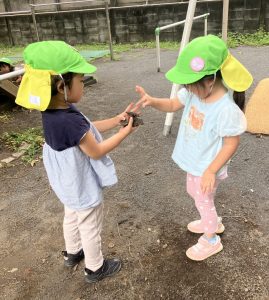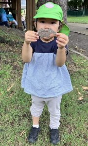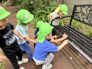ベンチの下に落ちている抜け殻を見つけましたが、触るのは少し怖いようで、触れるお友だちが手に取ると「わ~!こっち来ないで~!」と逃げる姿もありました(笑)