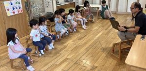 ちゅーりっぷ組さんにはまだ「平和」という言葉の意味は難しいかもしれませんが、みんながどんな時に嬉しい(幸せ)かを聞いてみると「ママとパパとご飯食べてるとき!」「お休みの日に公園に行くとき」「かき氷を食べている時」とそれぞれの答えが出てきました。