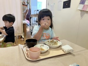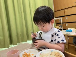 ↑食事の時も三点持ちやお皿に手を添えること意識していますよ。また一つ大きくなる準備、ここから始まっていますね。