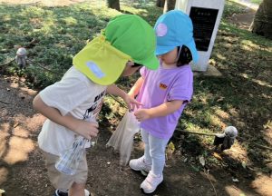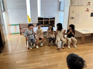 今朝の集まりまでの間、先生になりきった子どもたちが手遊びをして待っていてくれました(笑)グーチョキパーの手遊びをして、ひとりずつ前に出てきてやっていましたが、最後は数人集まってやっていましたよ。自然と握手もおきていました。