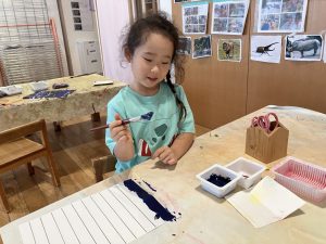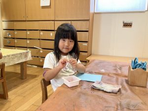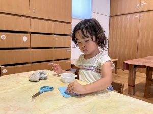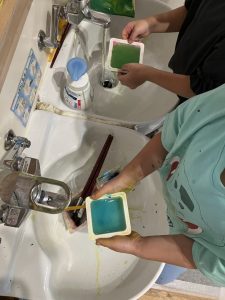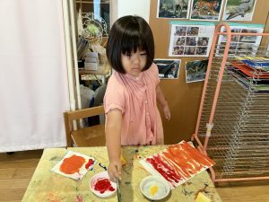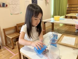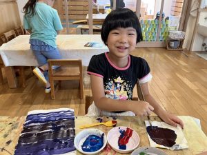 違う色の組み合わせをやってみる前に使っていた道具を洗っていたところ、水が入ることでキラキラときれいな薄さになることを発見!(色水遊びの時にも気づいていたお友だちがいました!)そこから絵の具の割合だけでなく、水の割合も工夫しながらさらに色の変化の面白さを感じていました♩