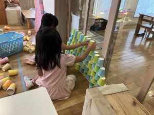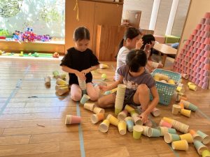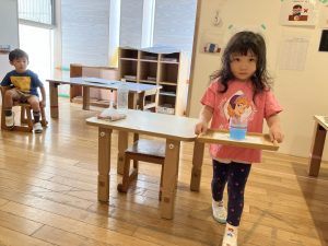 昨日から食事場所が変わり、今後は自分たちで配膳をするようにもなってきます。そこも見据えて、必要になる日常の動作を遊びにも取り入れ、最近はコップへの水注ぎ、お盆を使ったお水運びを楽しんでいます。遊びの中で自然と必要な力が身につくことを願っています。