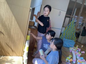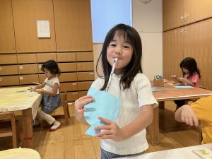 ↑今日はコップのような形だったので、ジュースに見立てる子が多かったです。新聞紙のストローもつけるとより嬉しいですね♪