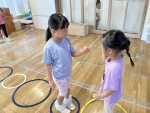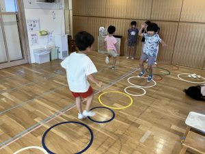 朝の会のあとは「ドン!ジャンケンポン」ゲームをしました。ルールは同じですが少しだけ違います。進み方はフラフープに両足跳びで入り進む。端っこまで行ったらお宝ひとつ持って帰れる。音楽が止まるまで続けて、最後に多い方が勝ちです 。