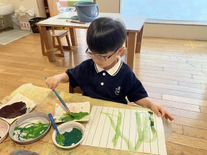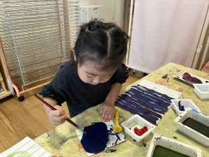 お部屋では絵の具遊びをしました。今日は2色を混ぜ、混ぜる絵の具の割合を変えることで色の濃さが変化することに気づき、絶妙な色の変化を楽しみながら、グラデーションを作り上げていました。