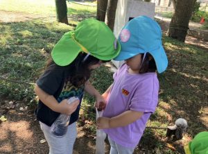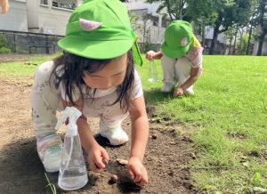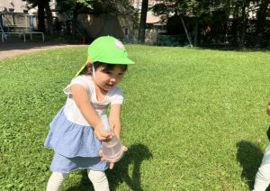 グラウンドへは霧吹きを持って出かけました。暑いので短時間でしたが、お友だちや先生と水をしゅっしゅとかけあいながら走り回って、体を動かすことができました♪(岩口、谷口)