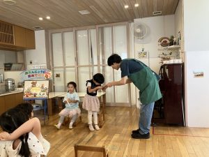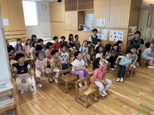 今日は9月生まれの子のお誕生日会がありました。お友だちからの質問は「好きな色は?」「好きなドレスは?」「好きな鬼滅は?」があがっていましたよ。好きなドレス!?と大人は困ってしまいそうな質問も難なく答えていましたよ(笑)お楽しみは『バナナのおやこ』の歌を歌い大盛り上がりでした。