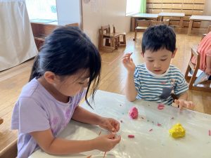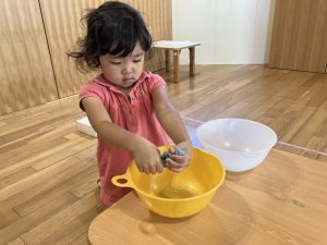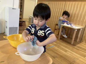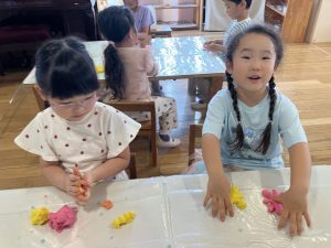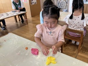 米粉粘土では、ケーキを作るなど見立てあそびの他にも、赤と黄色の2色を混ぜるという遊び方をする様子もありました。色水で3原色を扱ってきたこともあり、粘土でも赤と黄色が混ざるとオレンジに変化していく面白さを感じていましたよ。