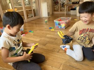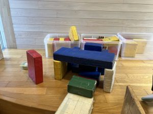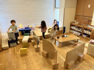 最近子どもたちから「牛乳パックブロックであそびたい!」と言われます。おままごとコーナーにプラスすると、新たなお部屋や家具ができたりして遊びが広がります。イメージを形にしそれをお友だちと共有して遊ぶことも上手になってきましたね。