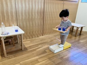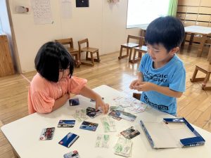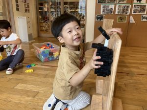 お誕生日会の後はお部屋とウッドデッキの選択をして過ごしました。前回のようにそれぞれの場所でできる遊びを伝えてから、希望を聞きました。自分の「やりたい」という思いに従って選ぶ姿はもちろん、一緒に遊びたいお友だちが選ぶ方はどちらか見て決める姿もあり、4歳児らしい姿だな~と感じました。(なんと、11人中10人がお部屋を選択しました(笑))