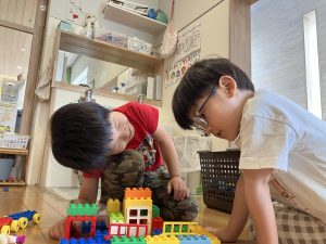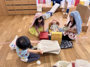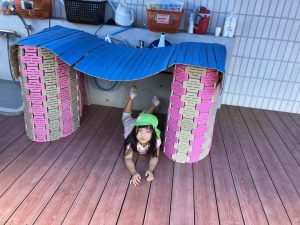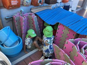 少し隠れられるスペースを見つけるとコソコソと入り「かくれんぼ」が始まっていました。「これしたほうがいいんじゃい?」と子どもたち同士で話し合う、お家ができると横になったりしていました。