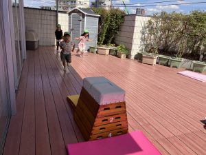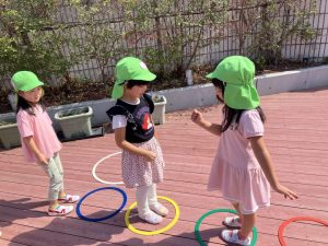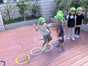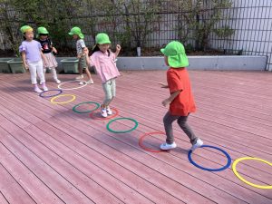 今日はウッドデッキで過ごしました。まず初めにどんじゃんけんぽん!ゲーム。前回に比べて、タイミングよくジャンプしながら進めていました。自分のチームがじゃんけんで負けると「つぎいけるよ!」「はい!つぎ!」と順番の子に声をかけあう姿も生まれていました。