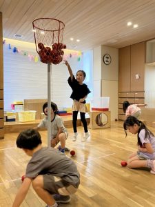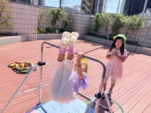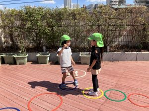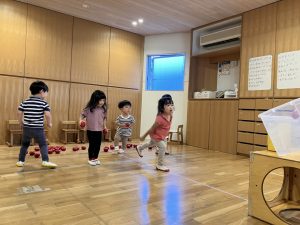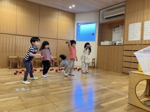 運動は日々の保育で出しているので、少しずつ上手になってきた子ども達。「こうやってやるんだよ!」とアドバイスする姿もあります。できるようになってきた喜びを感じた子どもたちは何度も挑戦していました。