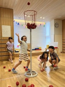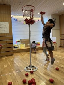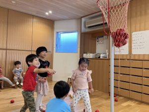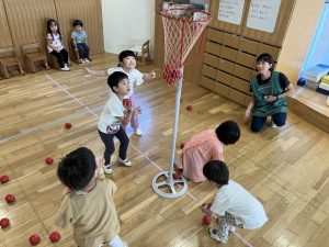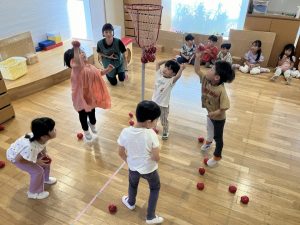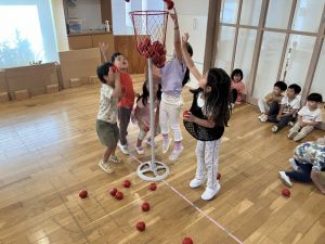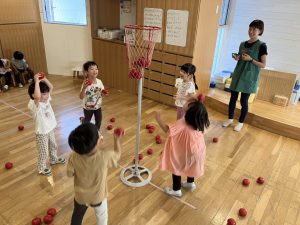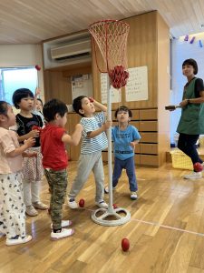 ひまわり組は身長が高くてジャンプしたら、かごに届きそう(笑) 少し背伸びしたら届きそうな子がたくさんいました。