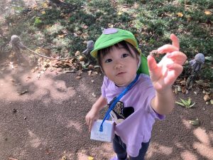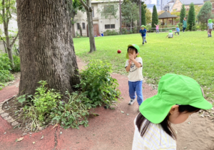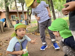 ↑木から離れた芝生の上にもどんぐりが落ちていました。保育士が「木から遠いのに何であるんだろう?」とつぶやくと「誰かが落っことしたやつなんじゃない?」と現実的な推測をしていましたよ(笑)