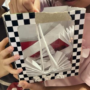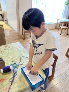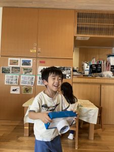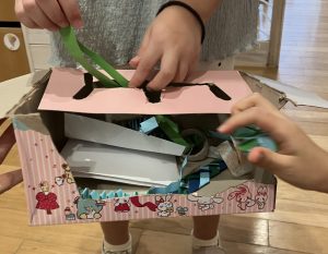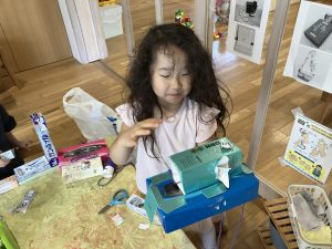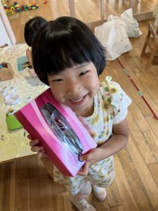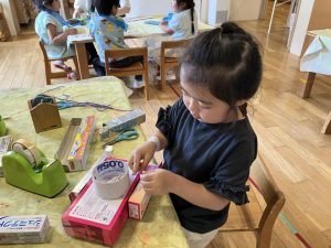 廃材製作では、いくつか見本を用意していたので、どんな形のものが必要か、どんな風につけられているかなど、その写真をよく見ながら作ったり、オリジナルのものを作ったり、思い思いに楽しむ姿がありました。テープの長さも、最初は必要以上に取ってしまうこともありましたが、それでは箱につける前にテープ同士がくっついて使えなくなってしまうなど気づきを得ながら、ちょうどいい長さに調整していましたよ。