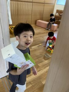 今日はお部屋と砂場の選択をしました。毎回選択の時には、その場所でできる遊びを最初に伝えてから、子どもたちに選んでもらうのですが、いつも「わ~!!」といい反応をしてくれるばら組さん(笑)今日あお部屋で廃材製作をする予定だったので、空き箱を見せると、「箱だ!何作ろう!!」と目を輝かせていました😊