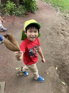 落ちていた葉に2つ穴が開いていて、それをお面のようにして「おばけだぞ~!」とお友だちを驚かせようとする様子もありました(笑)