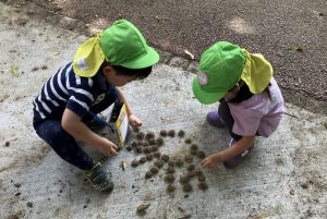 ↑砂をこんもりとさせた上にどんぐりを埋めてどんぐりケーキと言ってお友だちと作ることを楽しむ子もいました。お砂場道具を持っていって見立てて遊ぶことも楽しそうですね。