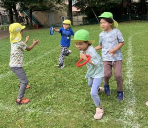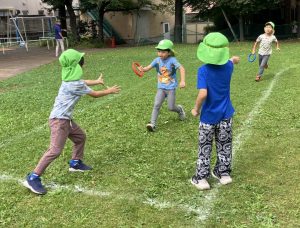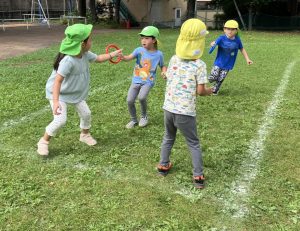 グラウンドでは、子どもたち自らリレーやドッジボールを始めていました。お友だちと声をかけあいながら、チーム分けをしたりしています。