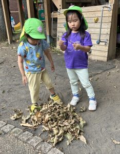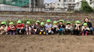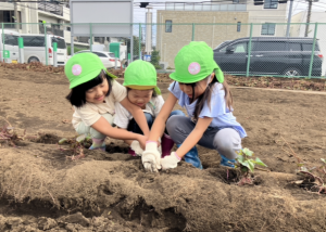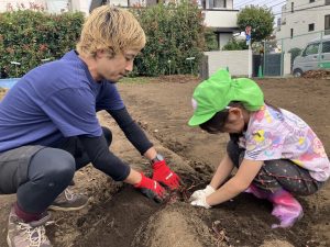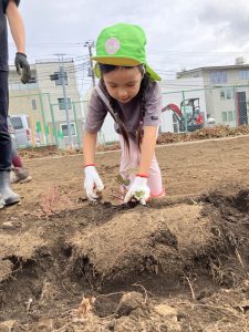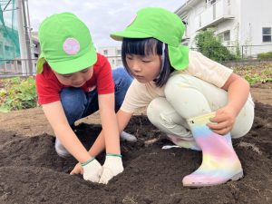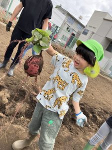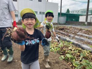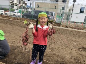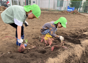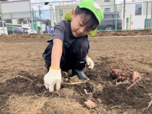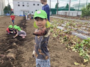 大きく丸いものから、細長いもの、手のひらサイズの小さなお芋が掘ることができました。「なんでこんなに繋がっているの~?」「3つごちゃんだね」と収穫したお芋を互いに見せ合っていました。今年のお芋は根っこが強いこと。ただ上に引っ張るだけでは抜けないので、周りの土を掘り起こし、少しずつ引っ張る方法で進めていました。1人で抜けない時には「誰か~手伝って~」「うんとこしょ」と力を合わせていましたよ。掘っても掘っても立派なお芋が出てきており、大収穫でした!「お家でどんな風にして食べようかな」「天ぷらとか?」「大学芋に決めてる」と食べることの期待が膨らんでいる会話で盛り上がっていました。