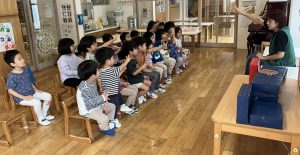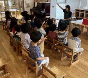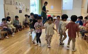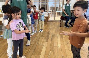 朝の会のあとは、じゃんけん列車をしました。じゃんけん列車の音楽に合わせて歩き、音楽が終わったときに近くにいたお友だちとじゃんけんをし、じゃんけんに勝った人が前に、負けた人が後ろにつながっていくことをくり返し、最終的には長い列車になる遊びです。ばら組の子どもたちにも手伝ってもらいながら、遊びのルールを確認し、実際にやってみました!