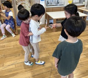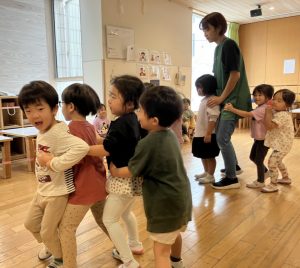 じゃんけんには勝ち負けがありますが、勝っても負けても楽しいじゃんけん列車♪負ける悔しさを感じたりする姿ももちろんありましたが、きっとすこしずつ、その悔しさを越えた楽しさを感じられるようになることでしょう!じゃんけんで手を出すタイミングを合わせることや、お友だちと歩幅を合わせながら歩くことなど、様々な力を調整する力も、遊びを通して育まれそうですね!今後も遊びの中に取り入れていきたいと思います。
