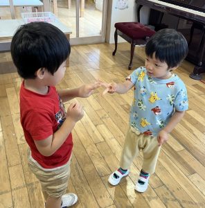 今日は2クラス、合同で朝の会をしました。みんなで手遊び、じゃんけんを楽しみました。
