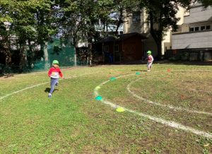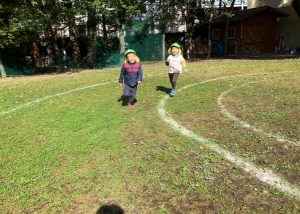 リレーではお友だちに渡す、しっかりと受け取る。バトンを落とさず全員が走り切ることができていました。