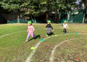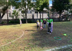 リレーではお友だちに渡す、しっかりと受け取る。バトンを落とさず全員が走り切ることができていました。