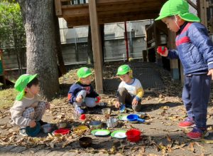 砂場道具をおままごとのように使ってもいいよ と伝えると料理屋さんが始まりました。
